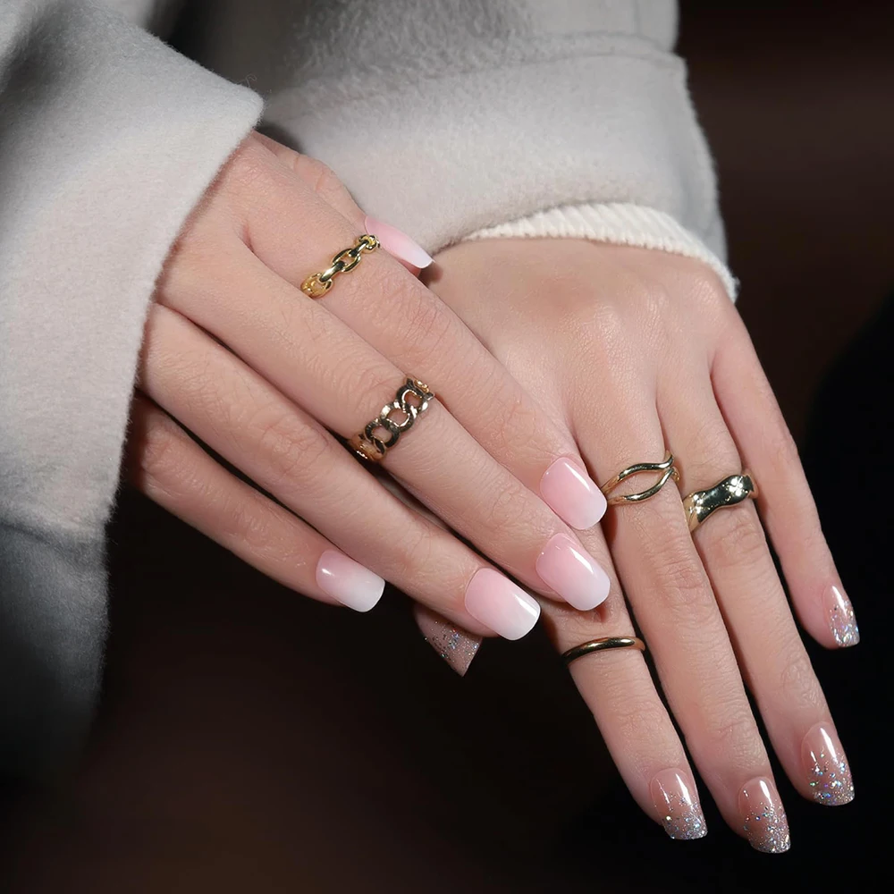 -576pcs (24 colors) false nails: 8 matte solid colors, 4 glossy solid color, 8 colors glitter press on nails, 2 colors press on nails french tip black and white. 1 nude with white color and 1 nude with glitter color.